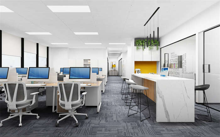 另一方面因為員工對于光線的遮擋會使室內采光減弱,這樣空間就會看上去相對陰暗狹小。所以工位盡量側邊靠窗,使員工能夠側面面光,一方面提升了員工舒適度,另一方面因為辦公區之間的過道,光線不會被遮擋,室內采光會更好,從而使空間敞亮,空間感提升。然而又到了不得不說的光線不足的時候,此時我們需要用到燈具進行采光,為了避免占用地面和桌面空間,應盡量減少使用落地燈和桌面燈光,轉而使用平板吊線燈或者是筒燈,這樣不僅光照度更強,而且也節約了成本。