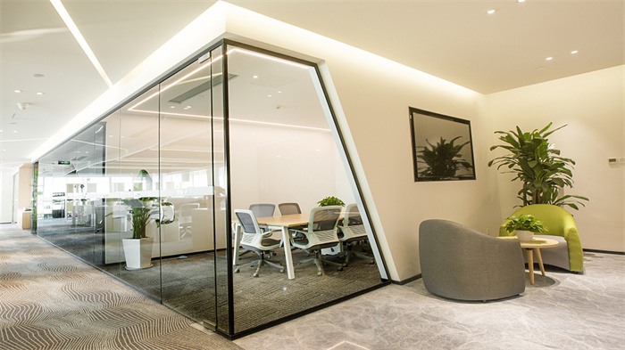 2、其次如何使玻璃隔斷和石膏板墻相結(jié)合,哪些墻面可以全部使用玻璃隔斷。這需要我們首先要了解玻璃隔斷的用法。一般來(lái)講,在辦公室裝修時(shí),房間與房間之間的隔斷都會(huì)使用石膏板隔開,朝外的有門的一面墻則會(huì)使用玻璃隔斷和玻璃門。一方面方便辦公室內(nèi)的采光和延展空間,另一方面可以使空間相對(duì)于全部使用石膏板來(lái)講更為美觀。對(duì)于石膏板墻和玻璃如何結(jié)合這種情況,需要具體看辦公室裝修的需求和設(shè)計(jì)師的設(shè)計(jì)。例如互聯(lián)網(wǎng)公司和科技公司,有些墻面可以使用斜切墻面的方式使斜著的石膏板墻面與玻璃隔墻相結(jié)合與整體辦公室的裝修風(fēng)格相接近,也有一些相對(duì)獨(dú)立出來(lái)的圓形或異型房間則可以全部使用玻璃隔斷,不僅呼應(yīng)辦公室裝修的整體風(fēng)格也更為通透。