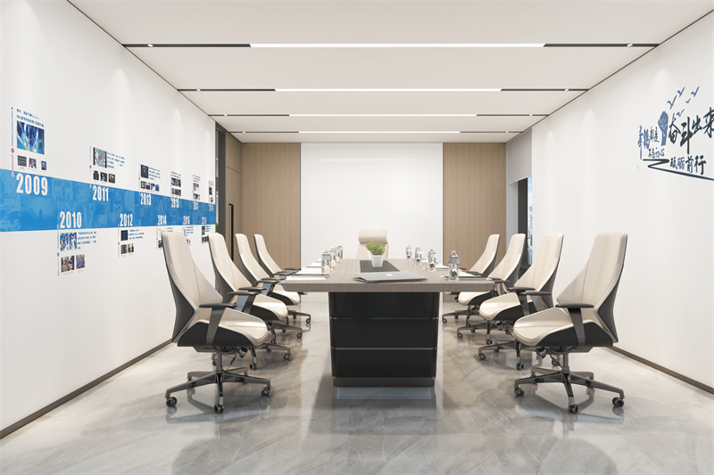 其次是會(huì)議室及洽談室這一類的獨(dú)立功能性區(qū)域,不僅需要考慮功能性照明,也許需要將空間的氛圍體現(xiàn)出來。比如使用內(nèi)嵌的線條燈和在其兩邊布置射燈突出會(huì)議室嚴(yán)肅的氣氛;使用線條燈和筒燈做一些造型用來使洽談室和茶水室氣氛活躍;