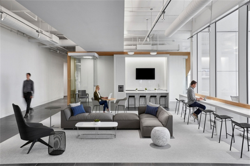 其次對于中大型的辦公室裝修,茶歇區或許更多是的是作為多功能的活動區、辦公區使用。那么在考慮完其他的空間利用之后,茶歇區則可以結合空間里的柱子,窗邊等做一些活動辦公桌、吧臺、卡座等以便于空間利用。如果辦公室空間很大,需要單獨設置一些茶水區使用,那么就可以對于空間里的‘卡槽’區域進行鑲嵌使用,如果沒有這些區域也可以如上所述將一些獨立辦公房間墻壁向內推進一部分,留出茶水柜位置作為茶水區使用。